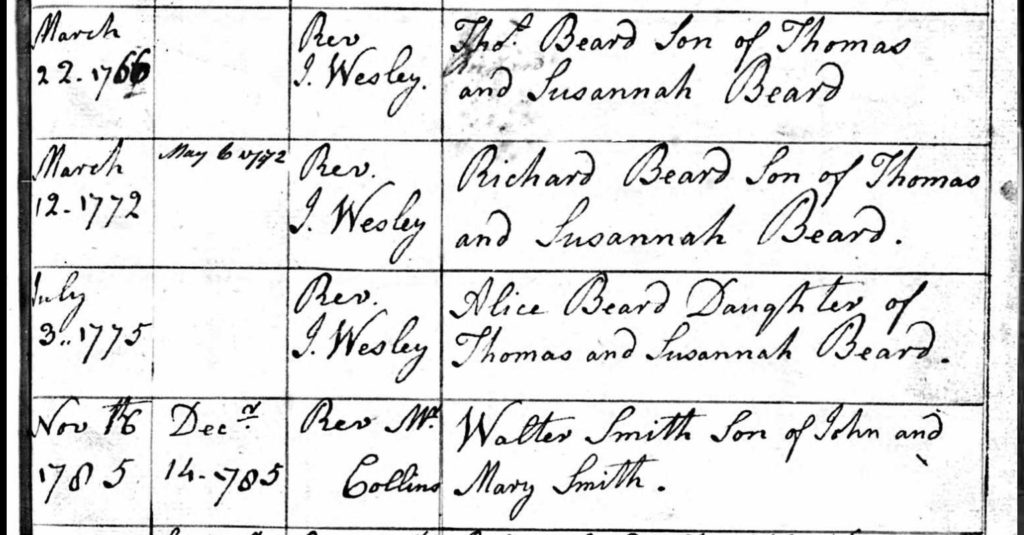 The entry in the register of non-conformist baptisms sees the children of Thomas and Susannah Beard baptised by a Rev J Wesley. Could this be THE John Wesley? Wesley was an English cleric, theologian and evangelist who was a leader of a revival movement within the Church of England known as Methodism. The societies he founded became the dominant form of the independent Methodist movement that continues to this day.