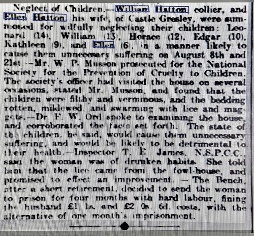It was, as they say, grim up north. Or at least, when you were working class in the Midlands anyway. A sad piece of contemporary news has turned up about Annette’s second great uncle and aunt, William and Ellen Hatton, from Castle Gresley. In 1913 they were summoned for willfully neglecting their children: Leonard (14), William (13), Horace (12), Edgar (10), Kathleen (9) and Ellen (6), in a manner likely to cause them unnecessary suffering. Their story was revealed in the Leicester Chronicle;