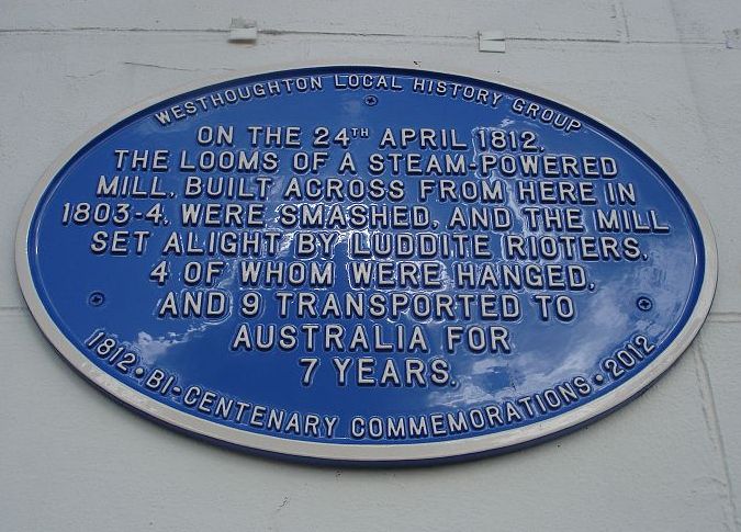 On Friday April 24th 1812 a mob 60-100 strong attacked the mill of Thomas Rowe and James Duncough at West Houghton. Trouble had been expected for some time and the military had maintained a presence at the mill for much of the week. However, by Friday they had gone and the mill, which housed 180 powerlooms, was left undefended except for 12 workers armed with borrowed guns. At about 4 p.m. the mob arrived at the mill. The Superintendent, Joseph Kay, rode to Bolton to fetch help, but by the time he returned the mill had been destroyed. The events had been witnessed by many workers and people who lived nearby, and this was to prove crucial when the cases came to trial. The event is commemorated today: