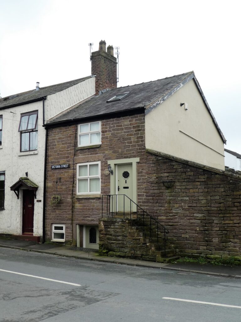 The handloom became an essential item of household furniture, and its influence on house design can be seen in parts of Lancashire to this day. The cottages either had the handlooms in the basement, the entrance to the living quarters up two or three steps, and a long row of windows alongside, to give light for working the loom, or in an upper room, in which the windows ran full length of the cottage.